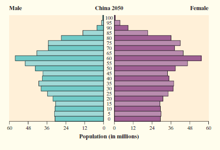 Population pyramids Refer to Exercise . Here is a graph of the projected population distribution for China in the year . Describe what the graph suggests about China’s future population. Be specific.