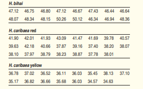Researchers from Amherst College studied the relationship between varieties of the tropical flower Heliconia on the island of Dominica and the different species of hummingbirds that fertilize the flowers. Over time, the researchers believe, the lengths of the flowers and the forms of the hummingbirds’ beaks have evolved to match each other. If that is true, flower varieties fertilized by different hummingbird species should have distinct distributions of length. The table below gives length measurements (in millimeters) for samples of three varieties of Heliconia, each fertilized by a different species of hummingbird. Do these data support the researchers’ belief? Follow the four-step process
