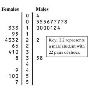1. Use the back-to-back stemplot in Figure to write a few sentences comparing the number of pairs of shoes owned by males and females. Be sure to address shape, center, spread, and outliers.
