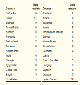Olympic gold! The following table displays the total number of gold medals won by a sample of countries in the Summer Olympic Games in China.