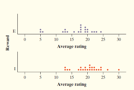 A dot-plot of the two groups’ creativity scores is shown below. Compare the two distributions. What do you conclude about whether external rewards promote creativity?
