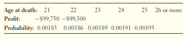 Life insurance A life insurance company sells a term insurance policy to a-year-old male that pays if the insured dies within the next years. The probability that a randomly chosen male will die each year can be found in mortality tables. The company collects a premium of each year as payment for the insurance. The amount Y that the company earns on this policy is per year, less the that it must pay if the insured dies. Here is a partially completed table that shows information about risk of mortality and the values of profit earned by the company: