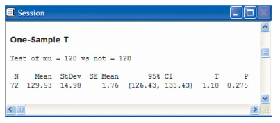 The health director of a large company is concerned about the effects of stress on the company鈥檚 middle-aged male employees. According to the National Center for Health Statistics, the mean systolic blood pressure for males 35 to 44 years of age is 128. The health director examines the medical records of a random sample of 72 male employees in this age group. The Minitab output below displays the results of a significance test and a confidence interval.