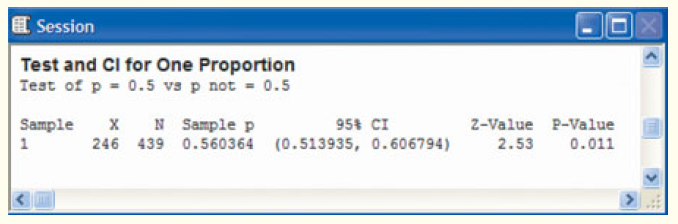 Teens and sex The Gallup Youth Survey asked a random sample of U.S. teens aged 13 to 17 whether they thought that young people should wait to have sex until marriage.17 The Minitab output below shows the results of a significance test and a 95% confidence interval based on the survey data.