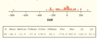 Does Friday the have an effect on people's behavior? Researchers collected data on the numbers of shoppers at a sample of different grocery stores on Friday the and Friday the in the same month. The dotplot and computer output below summarize the data on the difference in the number of shoppers at each store on these two days (subtracting in the order minus ).