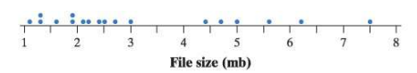 File sizes How much storage space does your music use? Here is a dotplot of the file sizes (to the nearest tenth of a megabyte) for 18 randomly selected files on Nathaniel鈥檚 mp3 player: