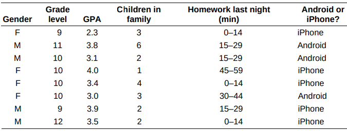 A class survey Here is a small part of the data set that describes the students in an AP庐 Statistics class. The data come from anonymous responses to a questionnaire filled out on the first day of class.