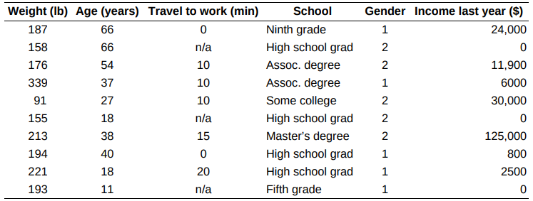 The following table includes data for 10 people chosen at random from the more than 1 million people in households contacted by the survey. 鈥淪chool鈥 gives the highest level of education completed.