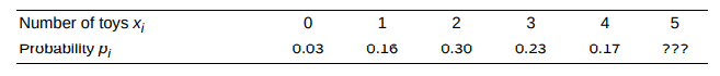Kids and toys In an experiment on the behavior of young children, each subject is placed in an area with five toys. Past experiments have shown that the probability distribution of the number X of toys played with by a randomly selected subject is as follows: