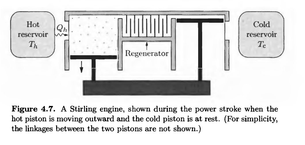 The ingenious Stirling engine is a true heat engine that absorbs heat from an external source. The working substance can be air or any other gas. The engine consists of two cylinders with pistons, one in thermal contact with each reservoir (see Figure 4.7). The pistons are connected to a crankshaft in a complicated way that we'll ignore and let the engineers worry about. Between the two cylinders is a passageway where the gas flows past a regenerator: a temporary heat reservoir, typically made of wire mesh, whose temperature varies