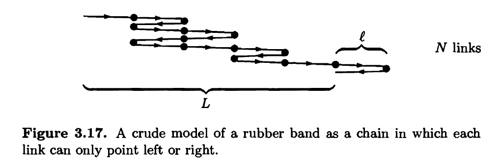 Polymers, like rubber, are made of very long molecules, usually tangled up in a configuration that has lots of entropy. As a very crude model of a rubber band, consider a chain of N links, each of length â„“(see Figure 3.17). Imagine that each link has only two possible states, pointing either left or right. The total length L of the rubber band is the net displacement from the beginning of the first link to the end of the last link.