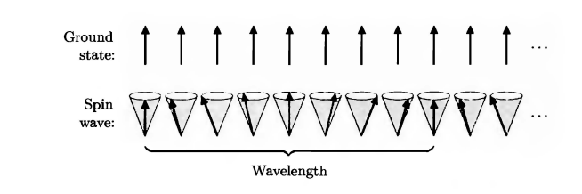 In the ground state of a ferromagnet, all the elementary dipoles point in the same direction. The lowest-energy excitations above the ground state are spin waves, in which the dipoles precess in a conical motion. A long-wavelength spin wave carries very little energy because the difference in direction between neighboring dipoles is very small.