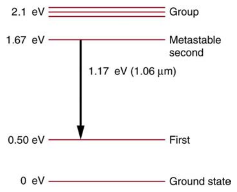 (b) Verify that the 1.17 eV transition produces 1.06 µm radiation. Figure 30.65 Neodymium atoms in glass have these energy levels, one of which is metastable. The group of levels above the metastable state is convenient for achieving a population inversion, since photons of many different energies can be absorbed by atoms in the ground state.