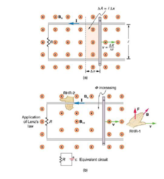 Use Faraday’s law, Lenz’s law, and RHR-1to show that the magnetic force on the current in the moving rod in Figure 23.11is in the opposite direction of its velocity.