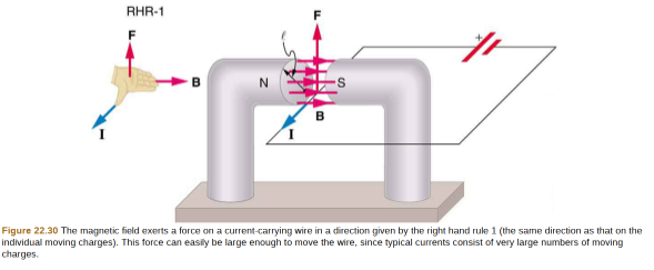 Draw a sketch of the situation in Figure 22.30 showing the direction of electrons carrying the current, and use RHR-1 to verify the direction of the force on the wire.