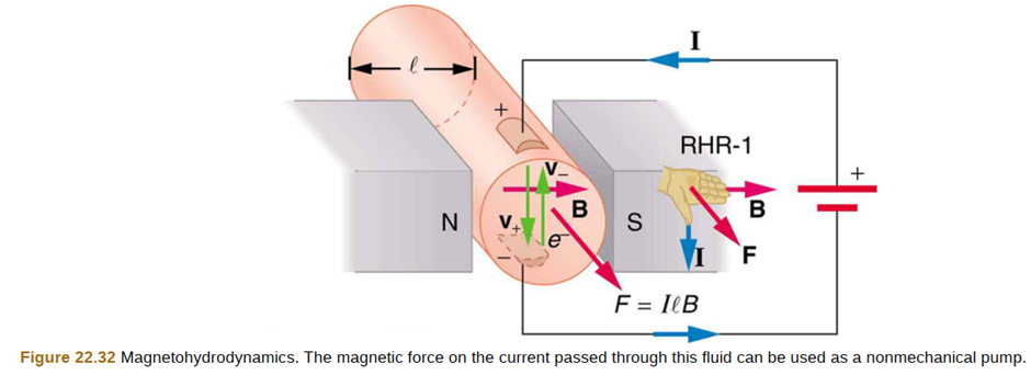 Verify that the direction of the force in an MHD drive, such as that in figure 22.32, does not depend on the sign of the charges carrying the current across the fluid.