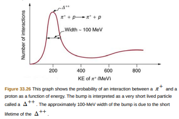 Accelerators such as the Triangle Universities Meson Facility (TRIUMF) in British Columbia produce secondary beams of pions by having an intense primary proton beam strike a target. Such "meson factories" have been used for many years to study the interaction of pions with nuclei and, hence, the strong nuclear force. One reaction that occurs is\({{\rm{\pi }}^{\rm{ + }}}{\rm{ + p}} \to {{\rm{\Delta }}^{{\rm{ + + }}}} \to {{\rm{\pi }}^{\rm{ + }}}{\rm{ + p}}\), where the \({{\rm{\Delta }}^{{\rm{ + + }}}}\)is a very short-lived particle. The graph in Figure \({\rm{33}}{\rm{.26}}\)shows the probability of this reaction as a function of energy. The width of the bump is the uncertainty in energy due to the short lifetime of the\({{\rm{\Delta }}^{{\rm{ + + }}}}\).