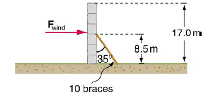 A \({\rm{17}}{\rm{.0}}\;{\rm{m}}\)high and \({\rm{11}}{\rm{.0}}\;{\rm{m}}\)long wall under construction and its bracing are shown in Figure \({\rm{9}}{\rm{.32}}\). The wall is in stable equilibrium without the bracing but can pivot at its base. Calculate the force exerted by each of the 10 braces if a strong wind exerts a horizontal force of \({\rm{650}}\;{\rm{N}}\)on each square meter of the wall. Assume that the net force from the wind acts at a height halfway up the wall and that all braces exert equal forces parallel to their lengths. Neglect the thickness of the wall.