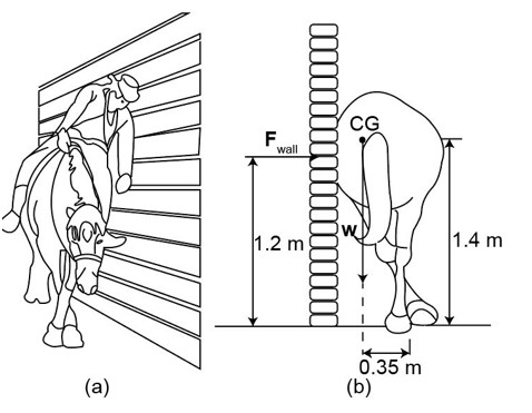 Suppose a horse leans against a wall, as in Figure 9.31. Calculate the force exerted on the wall assuming that force is horizontal while using the data in the schematic representation of the situation. Note that the force exerted on the wall is equal in magnitude and opposite in direction to the force exerted on the horse, keeping it in equilibrium. The total mass of the horse and rider is . Take the data to be accurate to three digits.