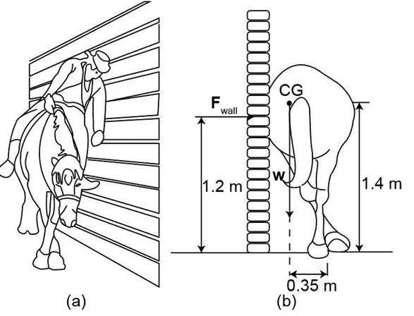 Calculate the magnitude and direction of the force on each foot of the horse inFigure\({\rm{9}}{\rm{.31}}\)(two are on the ground), assuming the center of mass of the horse is midway between the feet. The total mass of the horse and rider is \({\rm{500}}\;{\rm{kg}}\). (b) What is the minimum coefficient of friction between the hooves and ground? Note that the force exerted by the wall is horizontal.