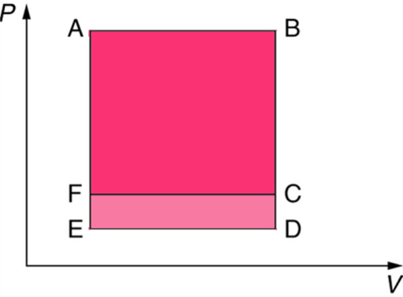 Which cyclical process represented by the two closed loops, ABCFA and ABDEA, on the PV diagram in the figure below produces the greatest net work? Is that process also the one with the smallest work input required to return it to point A? Explain your responses.
