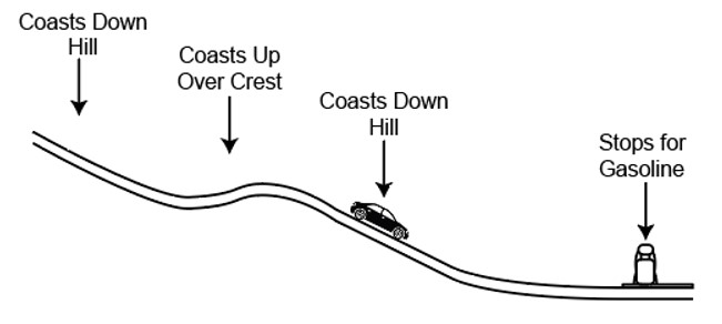 Figure 7.34 A car experiencing non-negligible friction coasts down a hill, over a small crest, then downhill again, and comes to a stop at a gas station.