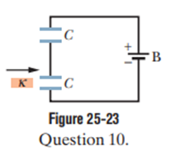 When a dielectric slab is inserted between the plates of one of the two identical capacitors in Fig. 25-23, do the following properties of that capacitor increase, decrease, or remain the same: (a) capacitance, (b) charge, (c) potential difference, and (d) potential energy? (e) How about the same properties of the other capacitor?