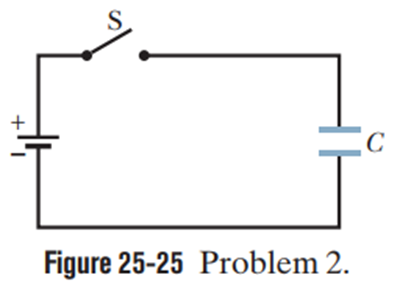 The capacitor in Fig. 25-25 has a capacitance of and is initially uncharged. The battery provides a potential difference of 120 VAfter switchis closed, how much charge will pass through it?