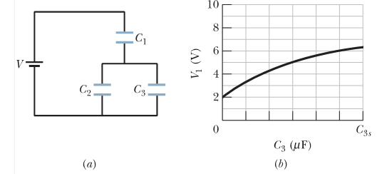 Capacitor 3 in Figure 25-41ais a variable capacitor(its capacitance can be varied). Figure 25-41bgives the electric potential across capacitor 1 versus . The horizontal scale is set by . Electric potential approaches an asymptote of 10V as . (a) What are the electric potential V across the battery? (b) , and (c) ?