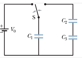 Figure 25-43 displays a battery and 3 uncharged capacitors of capacitancesand . The switch is thrown to the left side until capacitor 1 is fully charged. Then the switch is thrown to the right. (a) What is the final charge on capacitor 1? (b) What is the final charge on capacitor 2 ? (c) What is the final charge on capacitor 3?