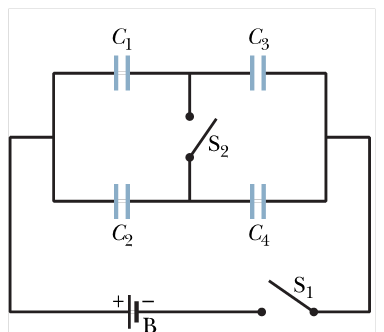 Figure 25-42 shows a 12 V battery and four uncharged capacitors of capacitances and . If only switch is closed, (a) What is the charge on capacitor 1, (b) What is the charge on capacitor 2, (c) What is the charge on capacitor 3, and (d) What is the charge on capacitor 4? (e) If both switches are closed what is the charge on capacitor 1? (f) If both switches are closed what is the charge on capacitor 2? (g) If both switches are closed what is the charge on capacitor 3? (h) If both switches are closed what is the charge on capacitor 4?
