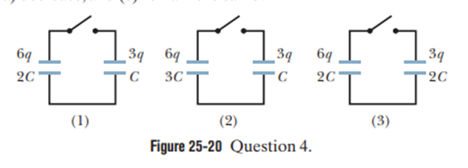 Figure 25-20 shows three circuits, each consisting of a switch and two capacitors, initially charged as indicated (top plate positive). After the switches have been closed, in which circuit (if any) will the charge on the left-hand capacitor (a) increase, (b) decrease, and (c) remain the same?