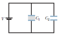 In figure, how much charge is stored on the parallel plate capacitors by the 12.0 Vbattery ? One is filled with air, and the other is filled with a dielectric for which k = 3.00; both capacitors have a plate area of and a plate separation of 2.00 mm.
