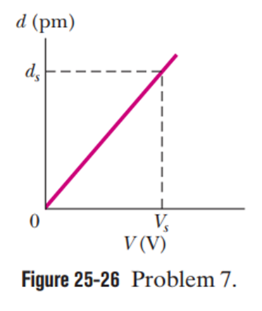 If an uncharged parallel-plate capacitor (capacitance C) is connected to a battery, one plate becomes negatively charged as electrons move to the plate face (area A). In Fig. 25-26, the depth dfrom which the electrons come in the plate in a particular capacitor is plotted against a range of values for the potential difference Vof the battery. The density of conduction electrons in the copper plates is . The vertical scale is set by and the horizontal scale is set by What is the ratio C/A?