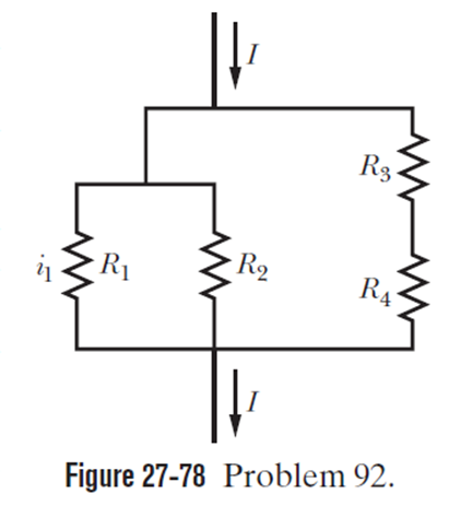 Figure 27-78 shows a portion of a circuit through which there is a current I=6.00A. The resistances are R1.=R2=2.00R3=2.OOR4=4.00What is the currenti1through resistor 1?