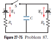 The circuit of Fig. 27-75 shows a capacitor, two ideal batteries, two resistors, and a switch S. Initially S has been open for a long time. If it is then closed for a long time, what is the change in the charge on the capacitor? Assume,, , , and.