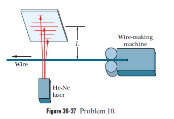 Manufacturers of wire (and other objects of small dimension) sometimes use a laser to continually monitor the thickness of the product. The wire intercepts the laser beam, producing a diffraction pattern like that of a single slit of the same width as the wire diameter (Fig.). Suppose a helium – neon laser, of wavelength , illuminates a wire, and the diffraction pattern appears on a screen at distance . If the desired wire diameter is , what is the observed distance between the two tenth-order minima (one on each side of the central maximum)?