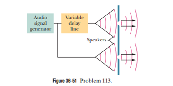 An acoustic double-slit system (of slit separation and slit width ) is driven by two loudspeakers as shown in Fig. 36-51. By use of a variable delay line, the phase of one of the speakers may be varied relative to the other speaker. Describe in detail what changes occur in the double-slit diffraction pattern at large distances as the phase difference between the speakers is varied from zero to . Take both interference and diffraction effects into account.