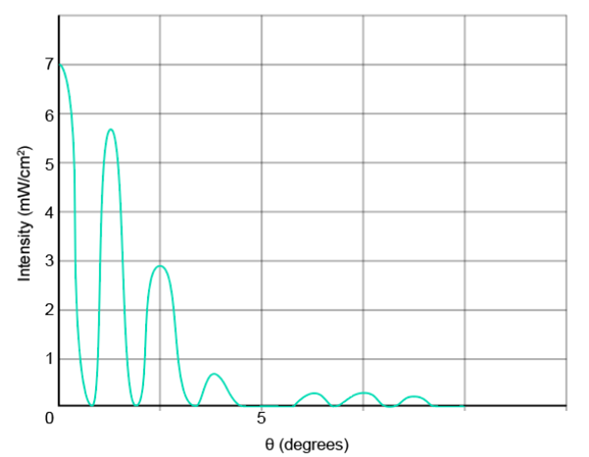 A circular obstacle produces the same diffraction pattern as a circular hole of the same diameter (except very near u 0).Airborne water drops are examples of such obstacles. When you see the Moon through suspended water drops, such as in a fog, you intercept the diffraction pattern from many drops. The composite of the central diffraction maxima of those drops forms a white region that surrounds the Moon and may obscure it. Figure 36-43 is a photograph in which the Moon is obscured. There are two faint, colored rings around the Moon (the larger one may be too faint to be seen in your copy of the photograph). The smaller ring is on the outer edge of the central maxima from the drops; the somewhat larger ring is on the outer edge of the smallest of the secondary maxima from the drops (see Fig. 36-10).The color is visible because the rings are adjacent to the diffraction minima (dark rings) in the patterns. (Colors in other parts of the pattern overlap too much to be visible.) (a) What is the color of these rings on the outer edges of the diffraction maxima? (b) The colored ring around the central maxima in Fig. 36-43 has an angular diameter that is 1.35 times the angular diameter of the Moon, which is 0.50°. Assume that the drops all have about the same diameter. Approximately what is that diameter?