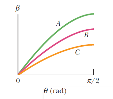 For three experiments, Fig.36-31 gives the parameter of Eq. 36-20 versus angle in two-slit interference using light of wavelength 500 nm. The slit separations in the three experiments differ. Rank the experiments according to (a) the slit separations and (b) the total number of two slit interference maxima in the pattern, greatest first.
