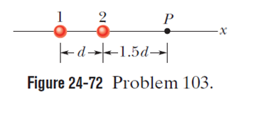 In Fig. 24-72, two particles of charges q1and q2are fixed to an x-axis. If a third particle, of charge, is brought from an infinite distance to point P, the three-particle system has the same electric potential energy as the original two-particle system. What is the charge ratio?