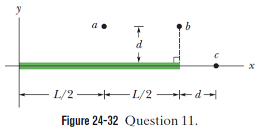 Figure 24-32 shows a thin, uniformly charged rod and three points at the same distance d from the rod. Rank the magnitude of the electric potential the rod produces at those three points, greatest first.