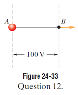 In Fig. 24-33, a particle is to be released at rest at point A and then is to be accelerated directly through point B by an electric field. The potential difference between points A and B is 100v . Which point should be at higher electric potential if the particle is (a) an electron, (b) a proton, and (c) an alpha particle (a nucleus of two protons and two neutrons)? (d) Rank the kinetic energies of the particles at point B, greatest first.