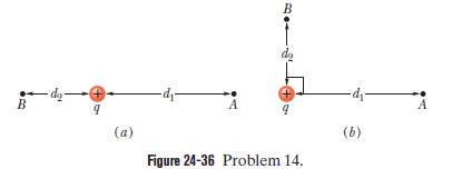 Consider a particle with charge q = 1.0 mC, point Aat distance d1 = 2.0 mfrom q, and point Bat distance d2 = 1.0 m. (a) If Aand B are diametrically opposite each other, as in Fig. 24-36a, what is the electric potential difference VA - VB? (b) What is that electric potential difference if Aand Bare located as in Fig. 24-36b?