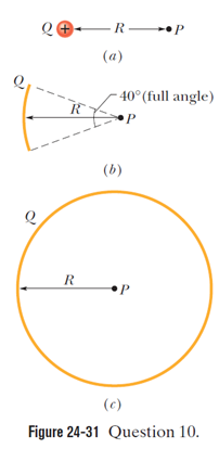 In Fig. 24-31a, what is the potential at point P due to charge Q at distance R from P? Set at infinity. (b) In Fig. 24-31b, the same charge has been spread uniformly over a circular arc of radius R and central angle 40. What is the potential at point P, the center of curvature of the arc? (c) In Fig. 24-31c, the same charge Q has been spread uniformly over a circle of radius R . What is the potential at point P , the center of the circle? (d) Rank the three situations according to the magnitude of the electric field that is set up at P, greatest first.