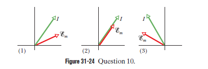 Figure 31-24 shows three situations like those in Fig. 31-15. Is the driving angular frequency greater than, less than, or equal to the resonant angular frequency of the circuit in (a) situation 1, (b) situation 2, and (c)situation 3?