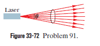 1 A helium–neon laser,radiating at, has a power output of . The beam diverges (spreads) at angle(Fig. 33-72). (a) What is the intensity of the beamfrom the laser? (b) What is the power of a point source providing that intensity at that distance?