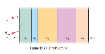 In Fig. 33-71, two light rays pass from air through five layers of transparent plastic and then back into air. The layers have parallel interfaces and unknown thicknesses; their indexes of refraction are. Ray b is incident at angle. Relative to a normal at the last interface, at what angle do (a) ray a and (b) ray b emerge? (Hint: Solving the problem algebraically can save time.) If the air at the left and right sides in the figure were, instead, glass with index of refraction 1.5, at what angle would (c) ray a and (d) ray b emerge?