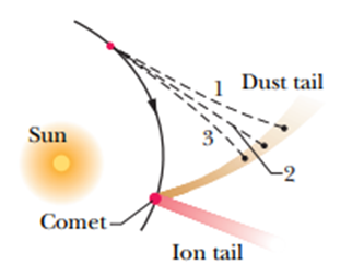 As a comet swings around the Sun, ice on the comet鈥檚 surface vaporizes, releasing trapped dust particles and ions. The ions, because they are electrically charged, are forced by the electrically charged solar wind into a straight ion tail that points radially away from the Sun (Fig. 33-39). The (electrically neutral) dust particles are pushed radially outward from the Sun by the radiation force on them from sunlight. Assume that the dust particles are spherical, have density , and are totally absorbing