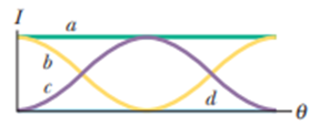 Suppose we rotate the second sheet in Fig. 33-15a, starting with the polarization direction aligned with the y axisand ending with it aligned with the x-axis. Which of the four curves in Fig. 33-26 best shows the intensity of the light through the three-sheet system during thisrotation?